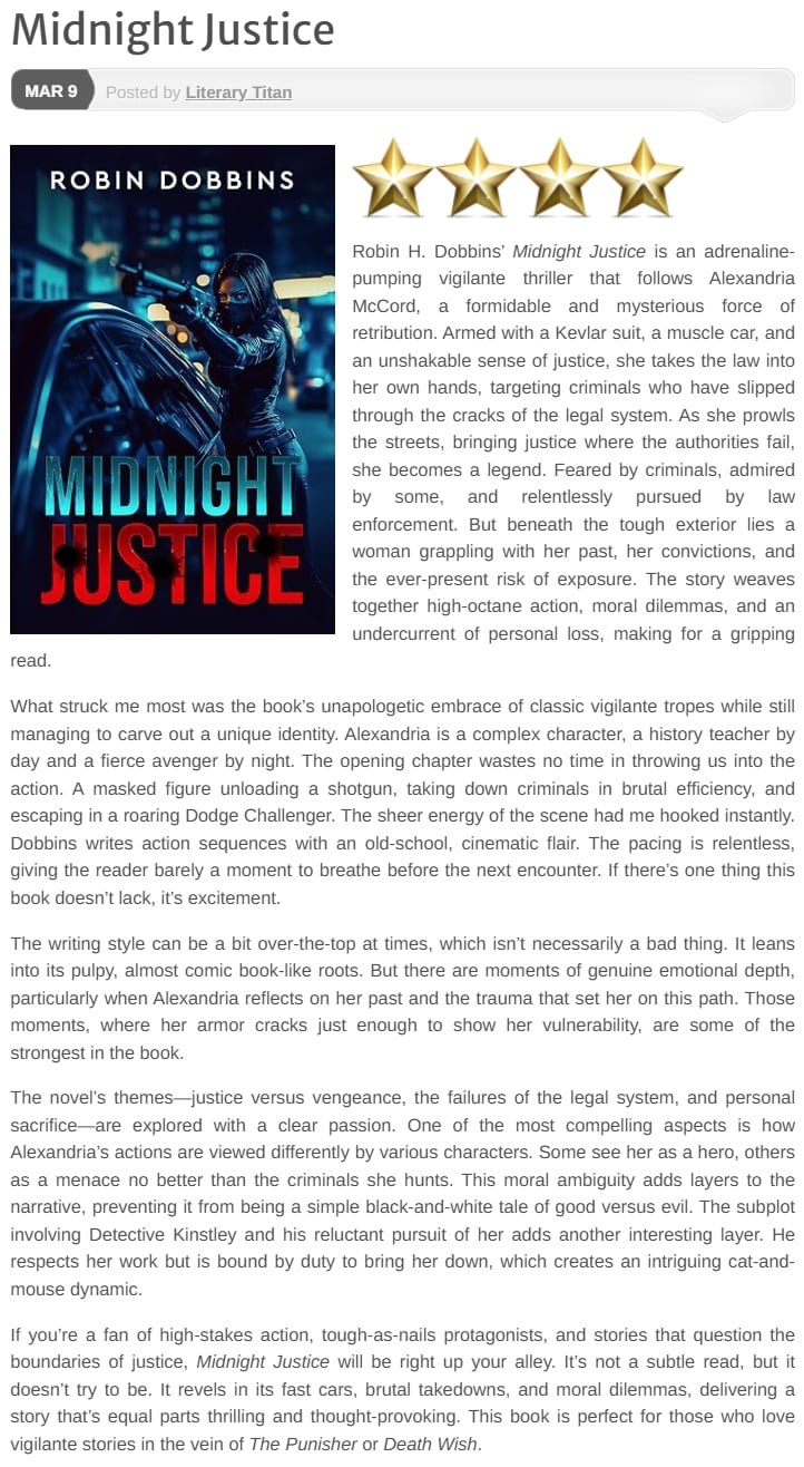 Robin primarily writes in the genres of historical fiction, drama, and health & wellness, with a focus on stories that explore resilience, justice, and redemption.